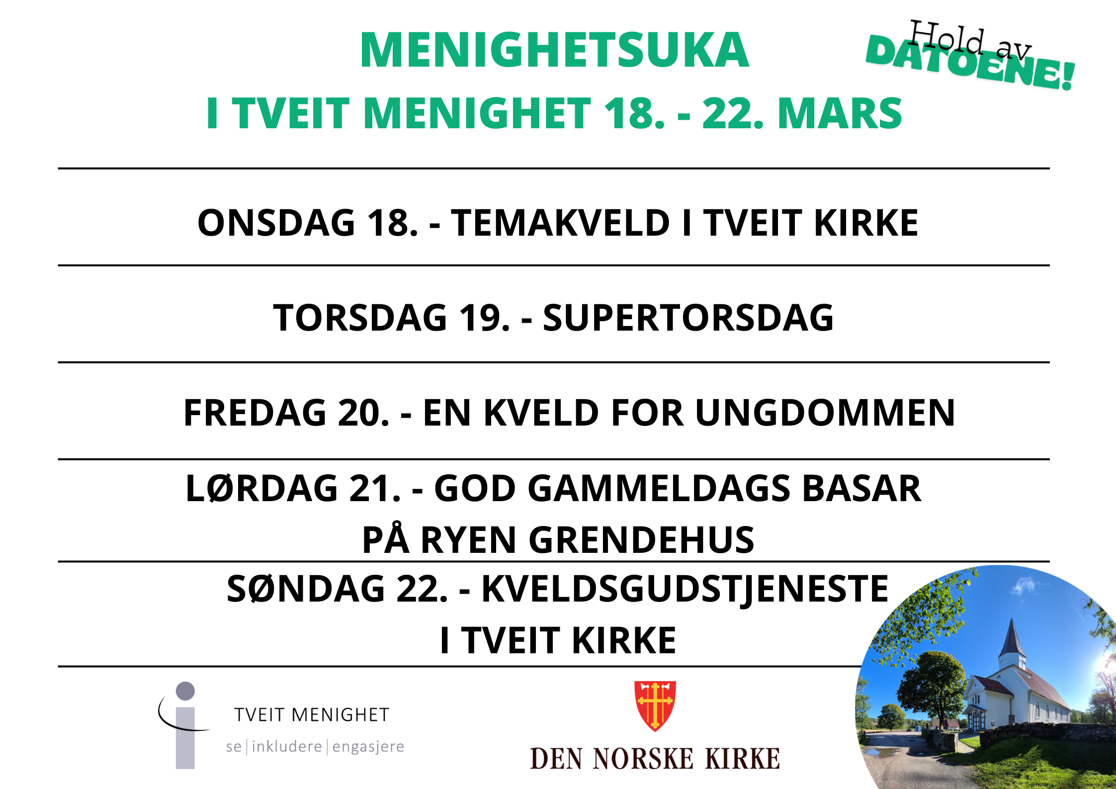 Velkommen til menighetsuka i Tveit 2026! Det kommer mer info fortløpende, men hold av datoene allerede nå!