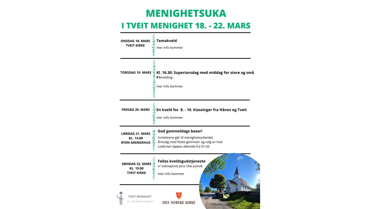 Velkommen til menighetsuka i Tveit 2026! Det kommer mer info fortløpende, men hold av datoene allerede nå!
