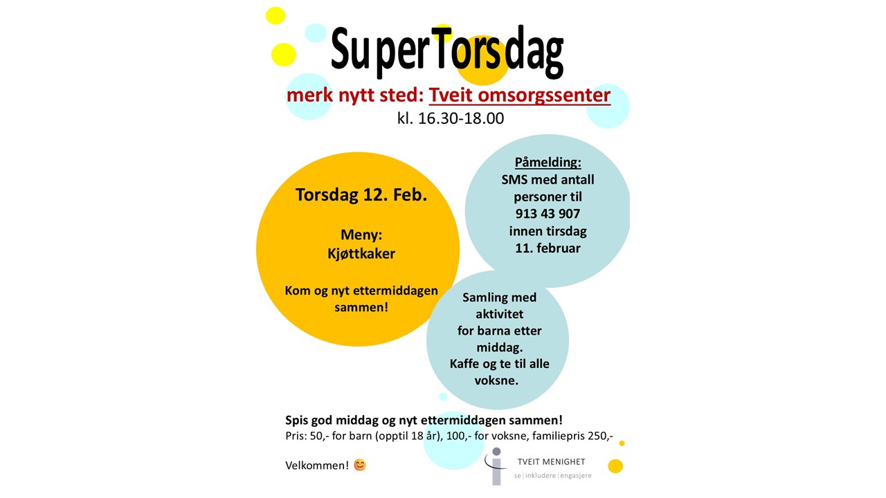 Velkommen til første SuperTorsdag i 2026 og første gang på nytt sted- nemlig Tveit omsorgsenter.